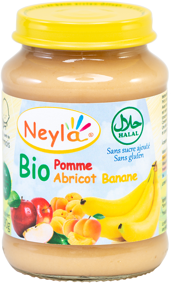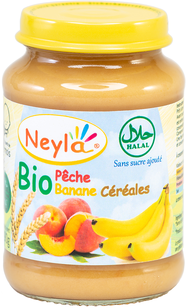 Ingrédients: *purée de pêche 33%, *purée de banane 30%, eau de cuisson, *concentré de jus de pomme, *farine de riz complet, *concentré de jus de citron.